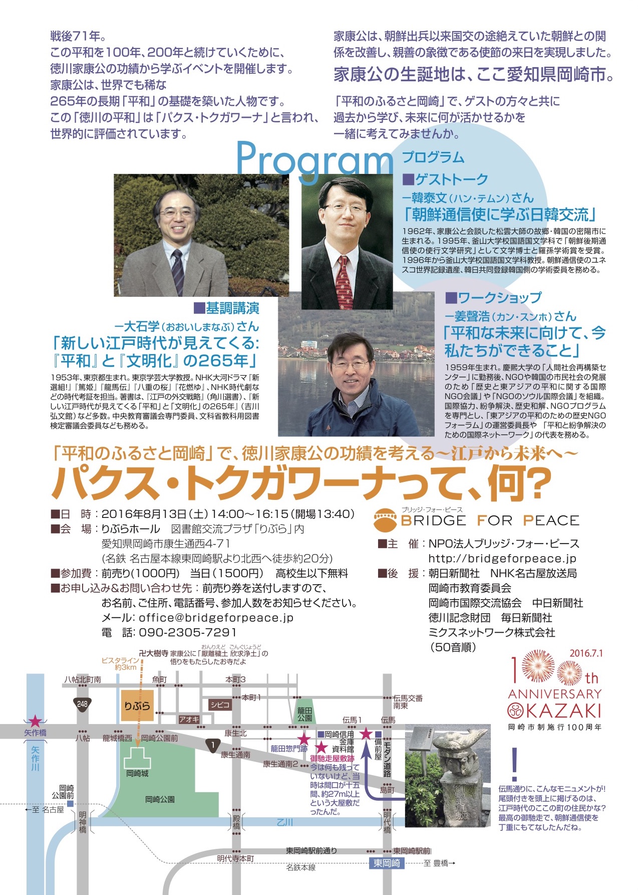 「平和のふるさと岡崎」で、ゲストの方々と共に過去から学び、未来に何が活かせるかを一緒に考えてみませんか。基調講演は、「新しい江戸時代が見えてくる:『平和』と『文明化』の265年」の著者、東京学芸大学教授の大石学先生。韓国からも、現代版朝鮮通信使として、朝鮮通信使のユネスコ世界記録遺産の学術委員をなどを務める釜山大学教授の韓泰文(ハン・テムン)先生のほか2名のゲストをお招きしています。